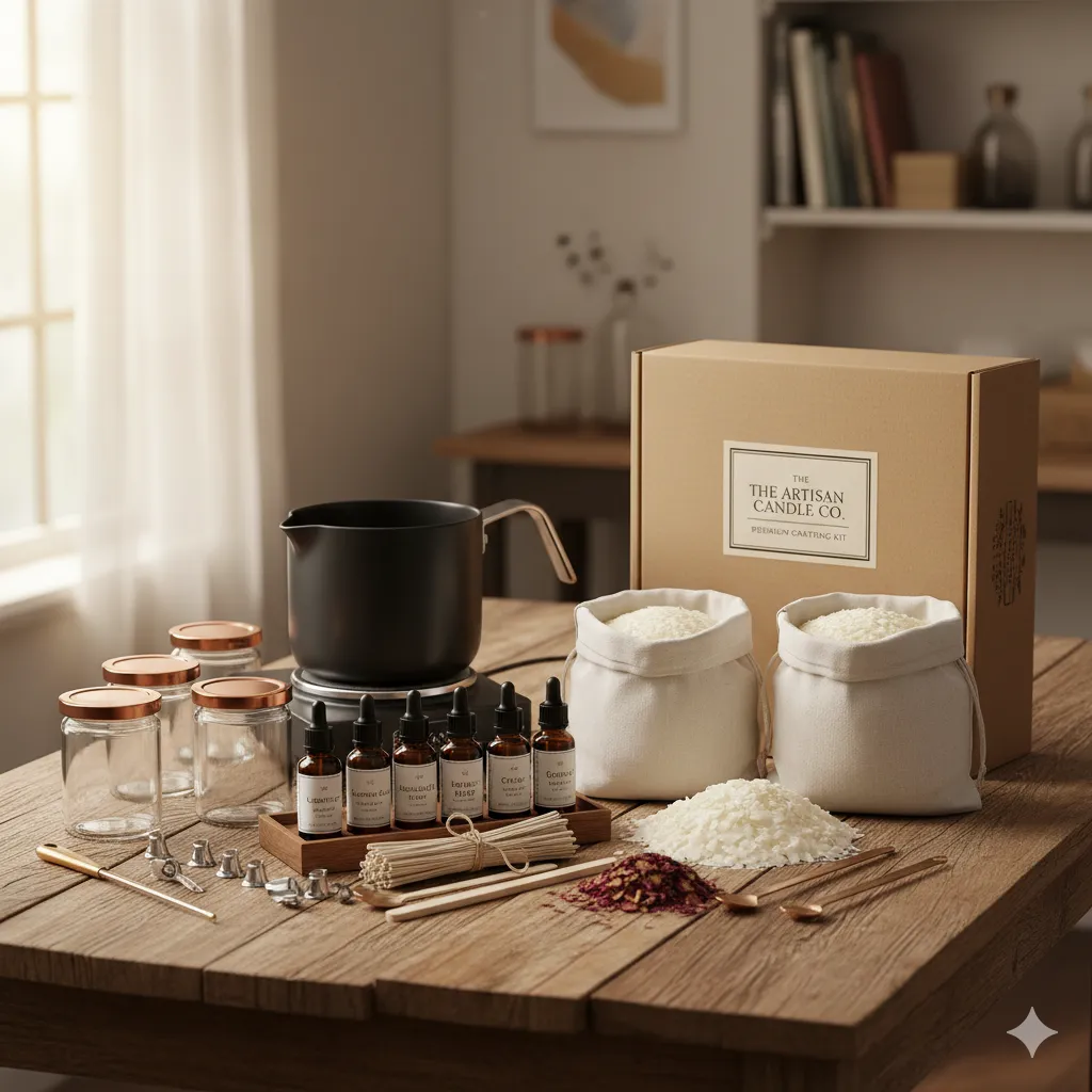 Complete starter kit includes soy wax, wicks, fragrance oils, containers, and all essential tools for creating beautiful candles at home.