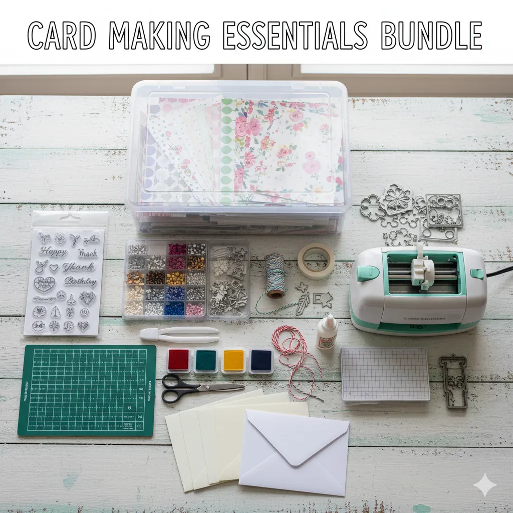 Everything you need for professional card making: premium cardstock, decorative papers, stamps, inks, embossing tools, and embellishments.