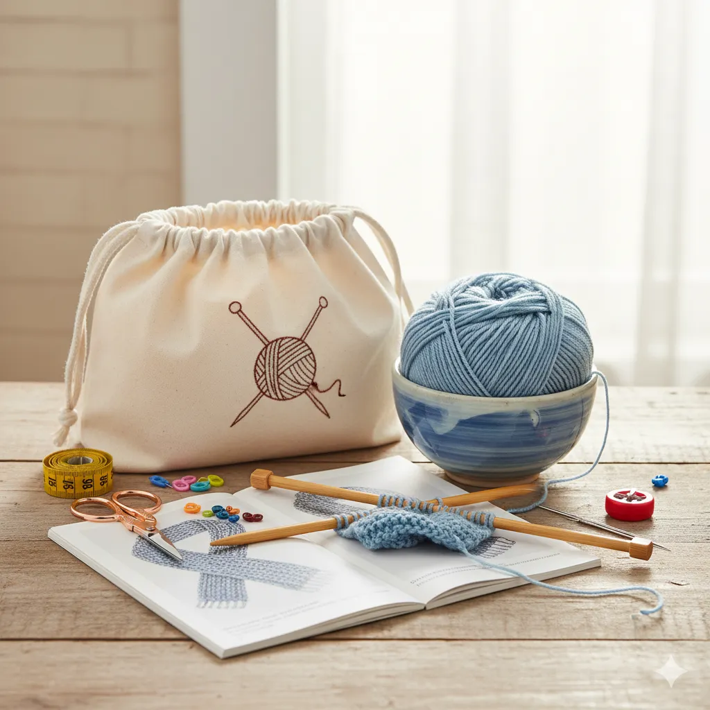 Beginner-friendly knitting set with soft yarns in various colors, knitting needles in multiple sizes, stitch markers, and pattern guides.